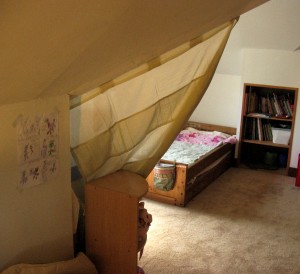 We took an old window curtain and tacked it up to a wall.